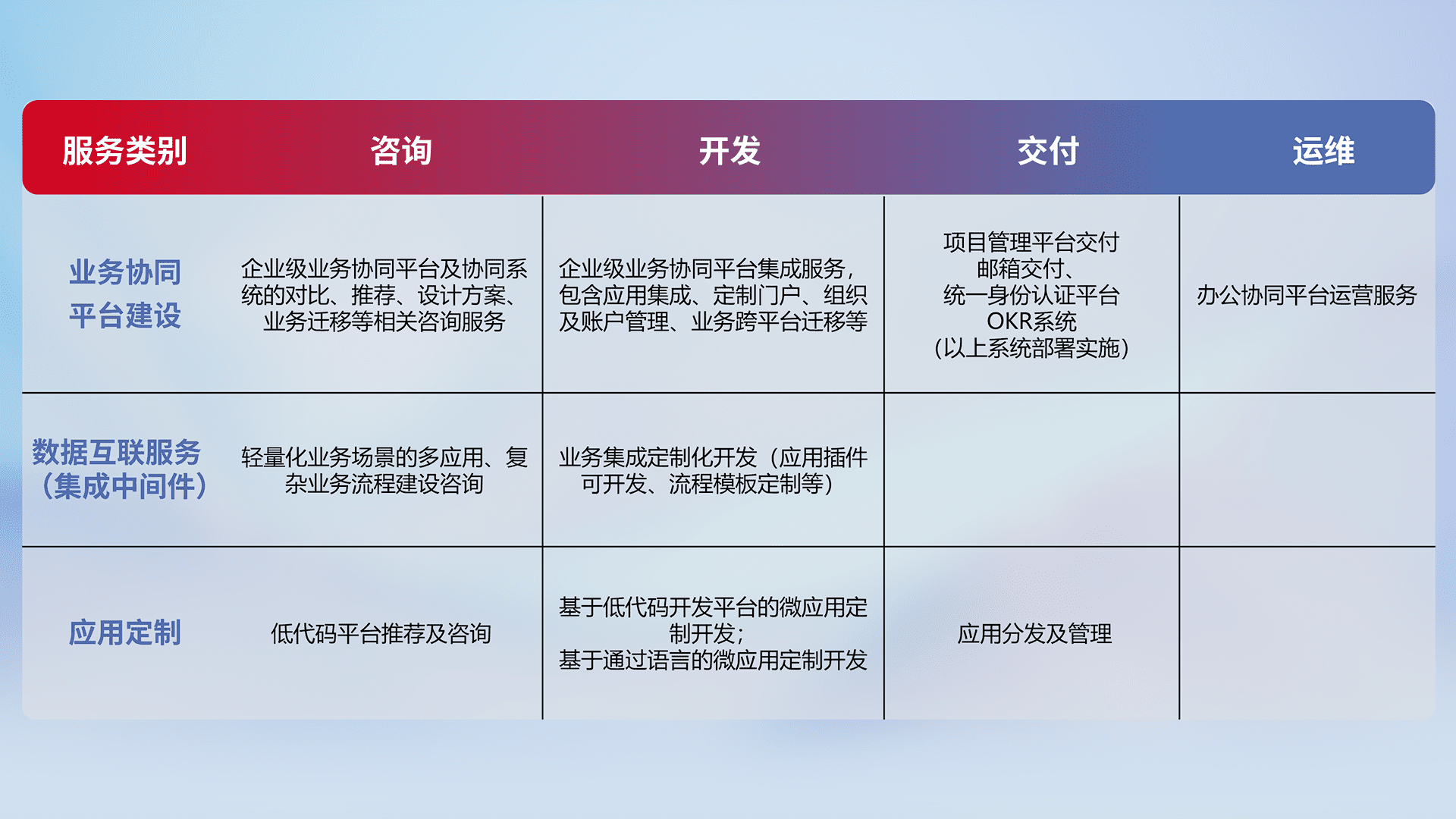 针对钉钉、、企微、、、、IDaas等平台级产品提供产品的规划、、、、方案、、交付、、定制化开发等服务,,,,实现如统一协同办公、、智能客户服务、、、混合会议管理、、智能数据查询、、等业务场景,,实现数字化转型。。。