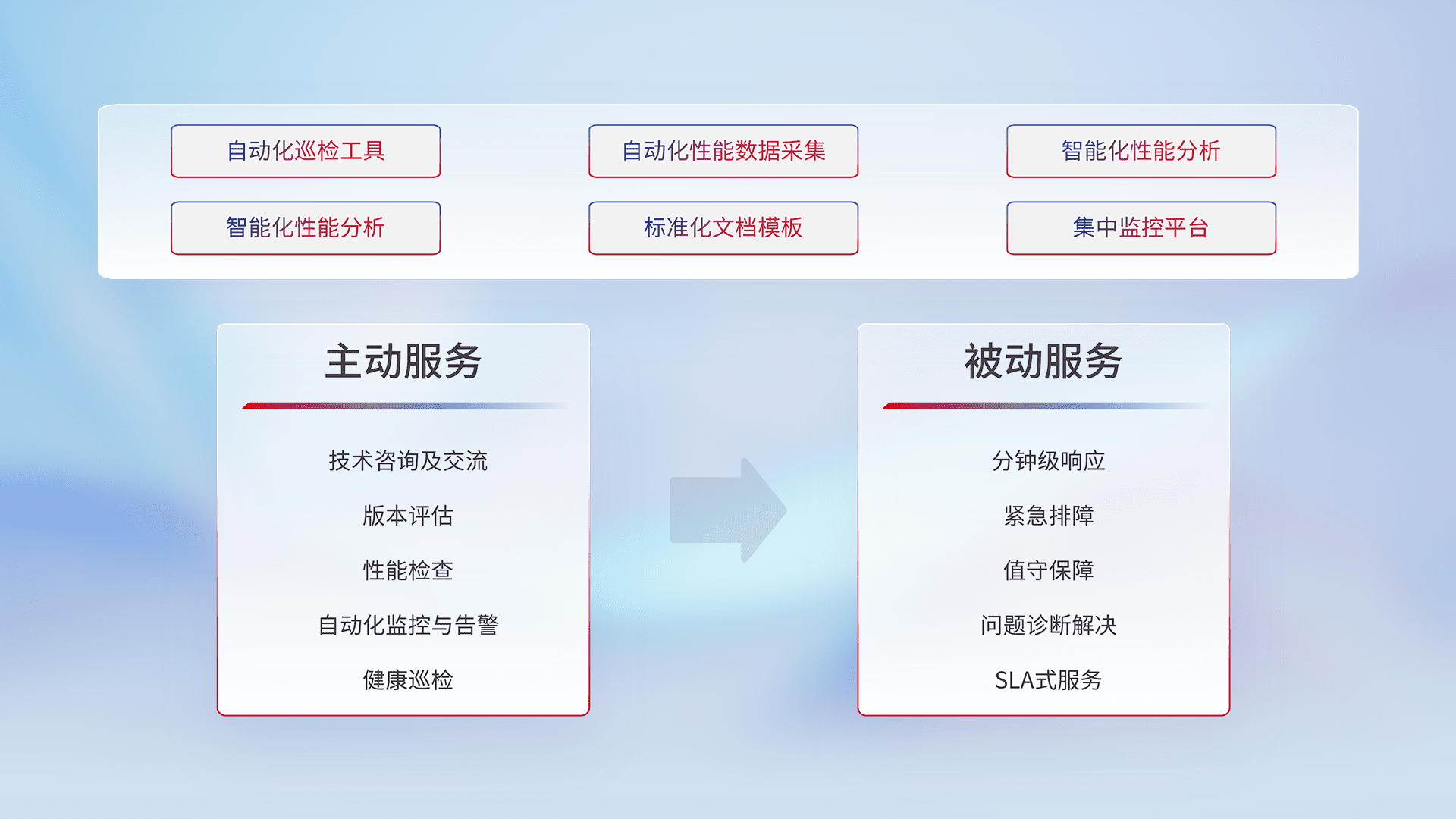 智能化工具和标准化文档,,,保障服务质量,,提供主动服务(包含技术咨询、、版本评估、、、性能检查、、、自动化监控与告警、、、健康巡检)和被动服务包含(分钟级响应、、紧急排障、、值守保障、、、、问题诊断解决、、SLA服务)。。。。